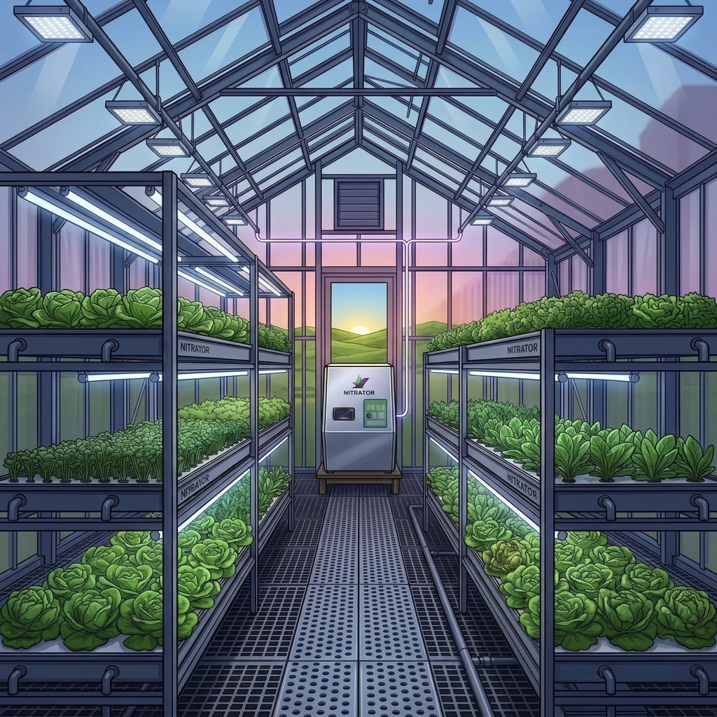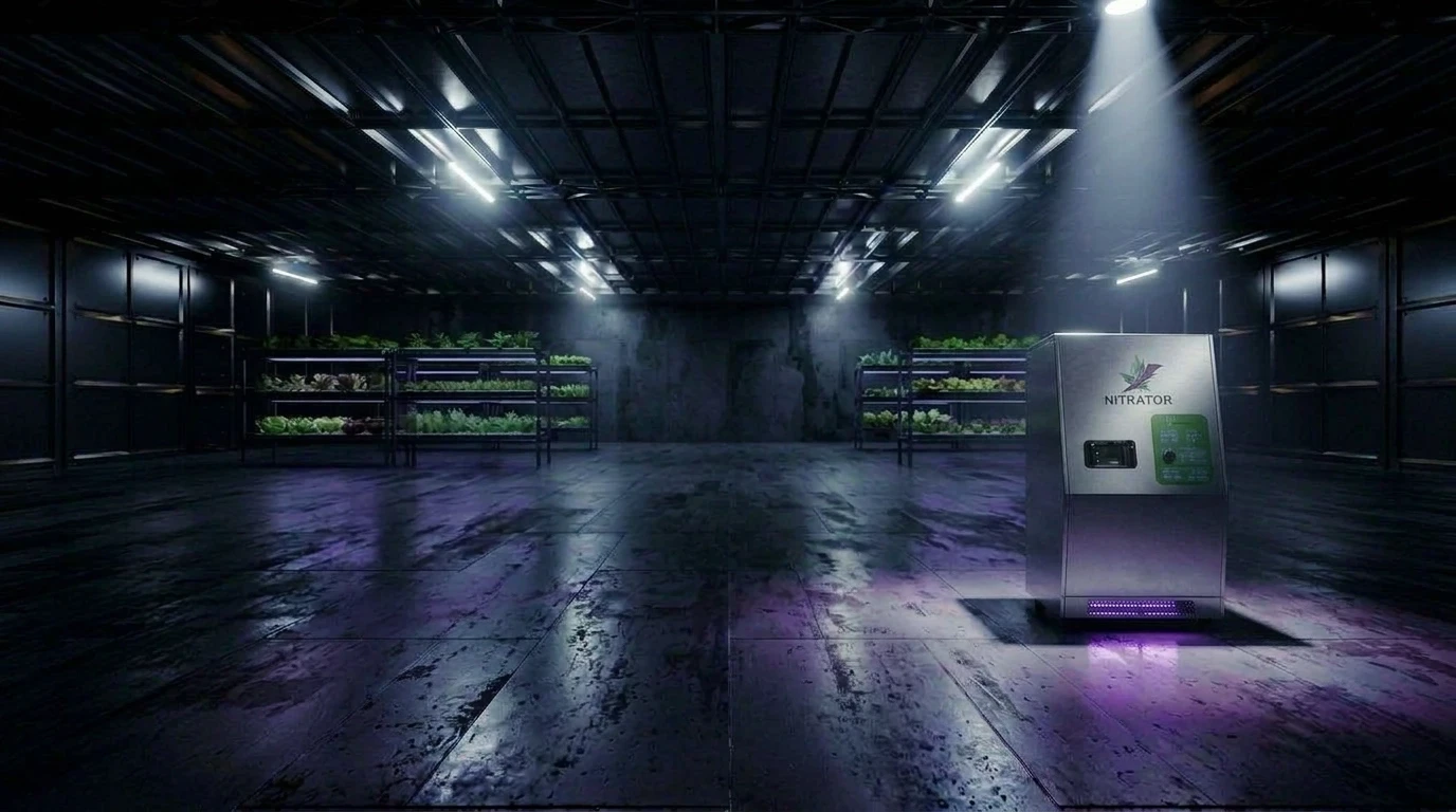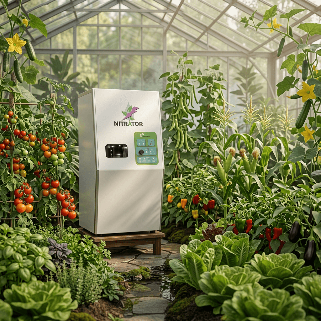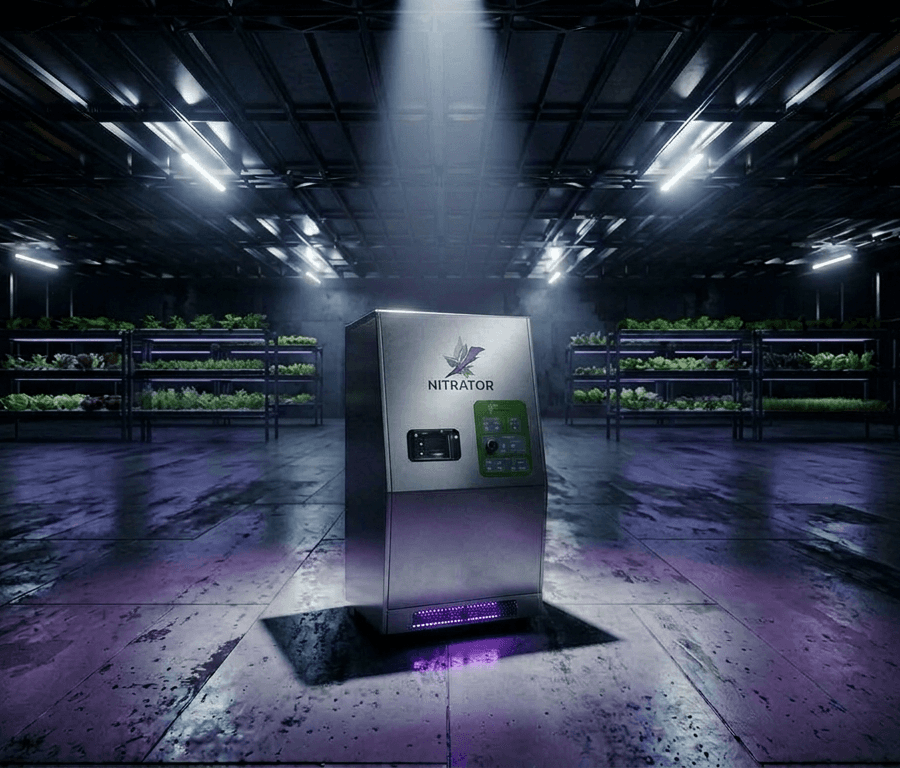 Zero synthetic chemicals. The Nitrator converts atmospheric nitrogen into plant-ready nitrate using only air, water, and electricity - nothing else in your system.