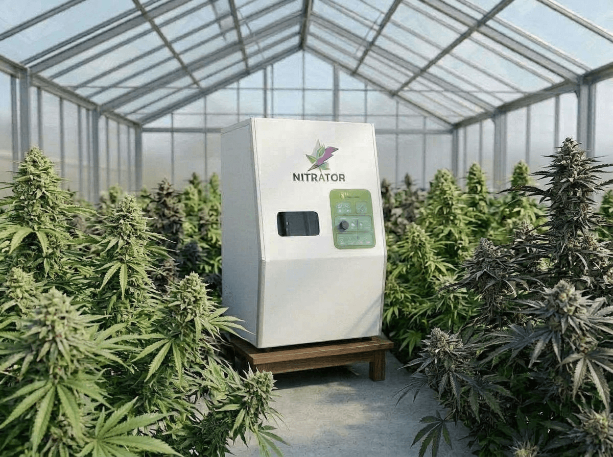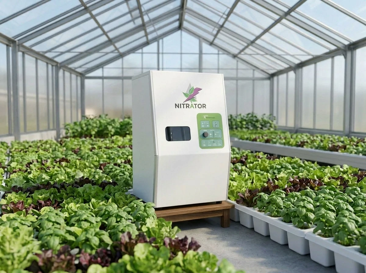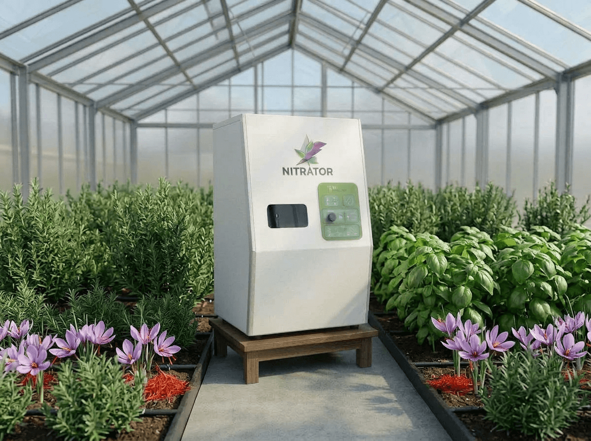 Zero synthetic chemicals. The Nitrator converts atmospheric nitrogen into plant-ready nitrate using only air, water, and electricity - nothing else in your system.