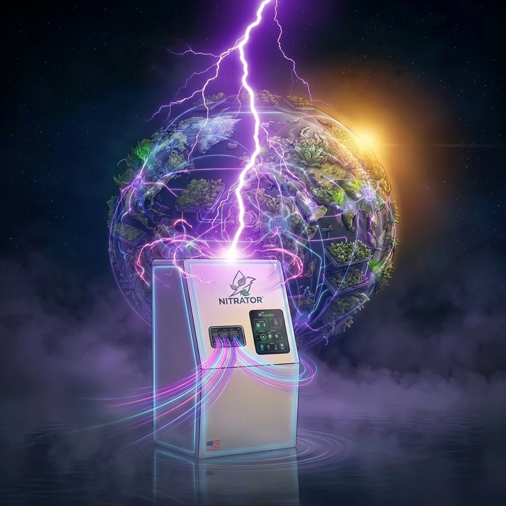 Our patented Nitrator™ replicates this process using a precision plasma chamber, water injection system, and air mixing chamber - producing NitroWater™ a pure, highly bioavailable liquid nitrogen fertilizer with no synthetic chemistry involved.